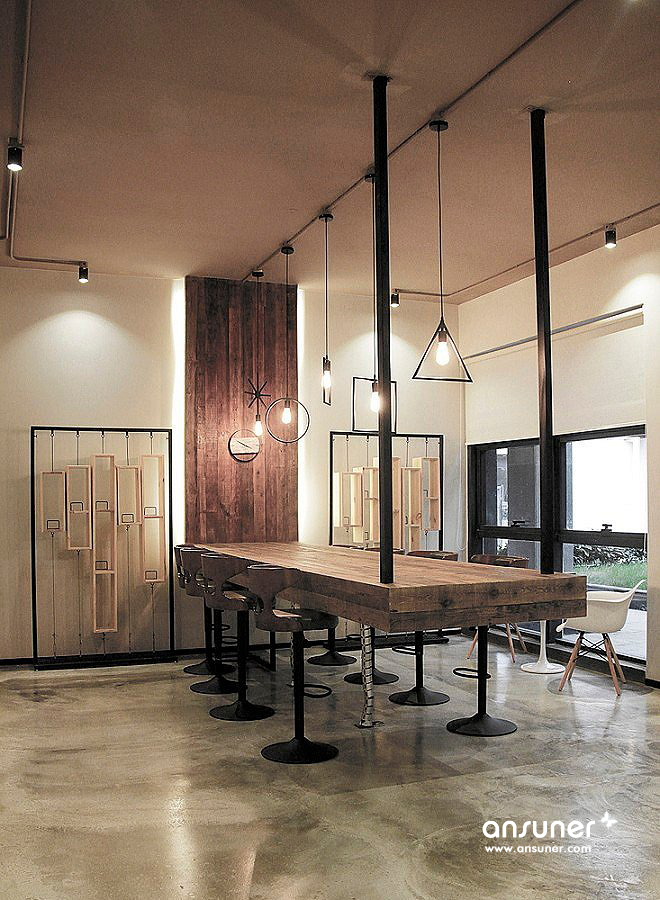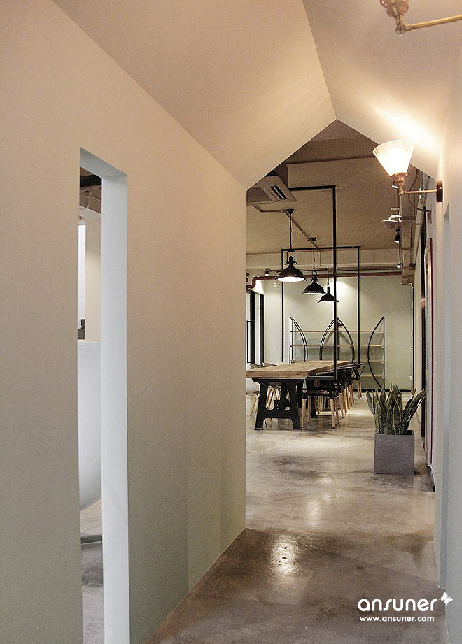 整体呈现出工业的样貌,搭配绿植景观设计,在拘谨与放松之间达成一个舒适的平衡点。