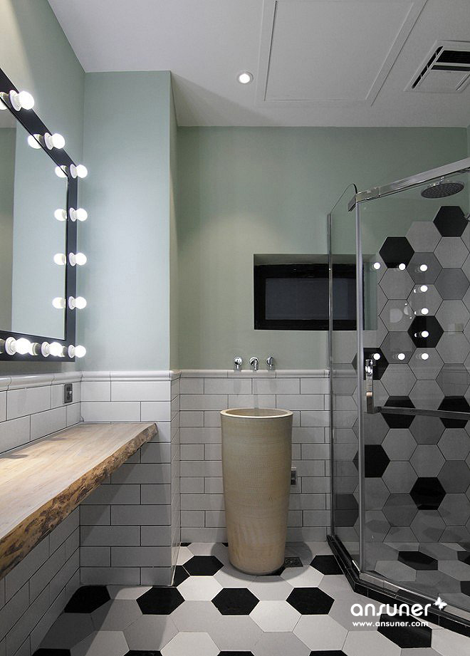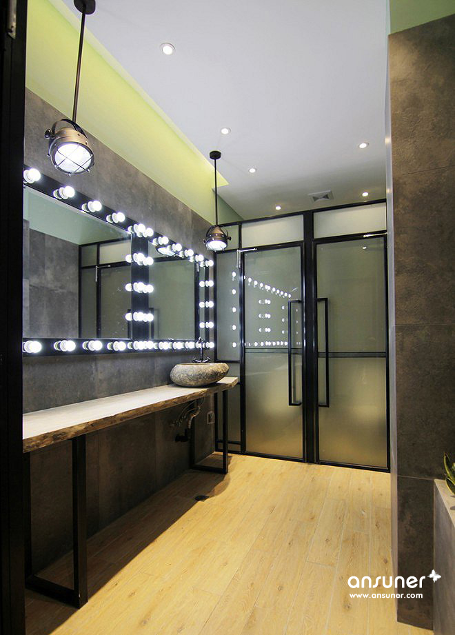 办公室里所有的卫生间也采用了实木和石头等自然元素。化妆灯不仅更好地提供功能服务,也展现了办公室的行业属性。