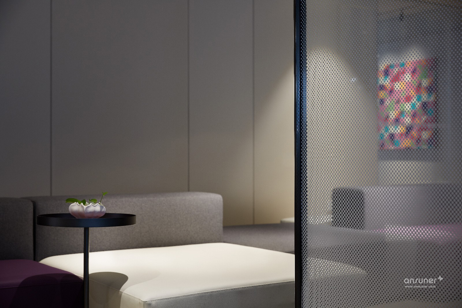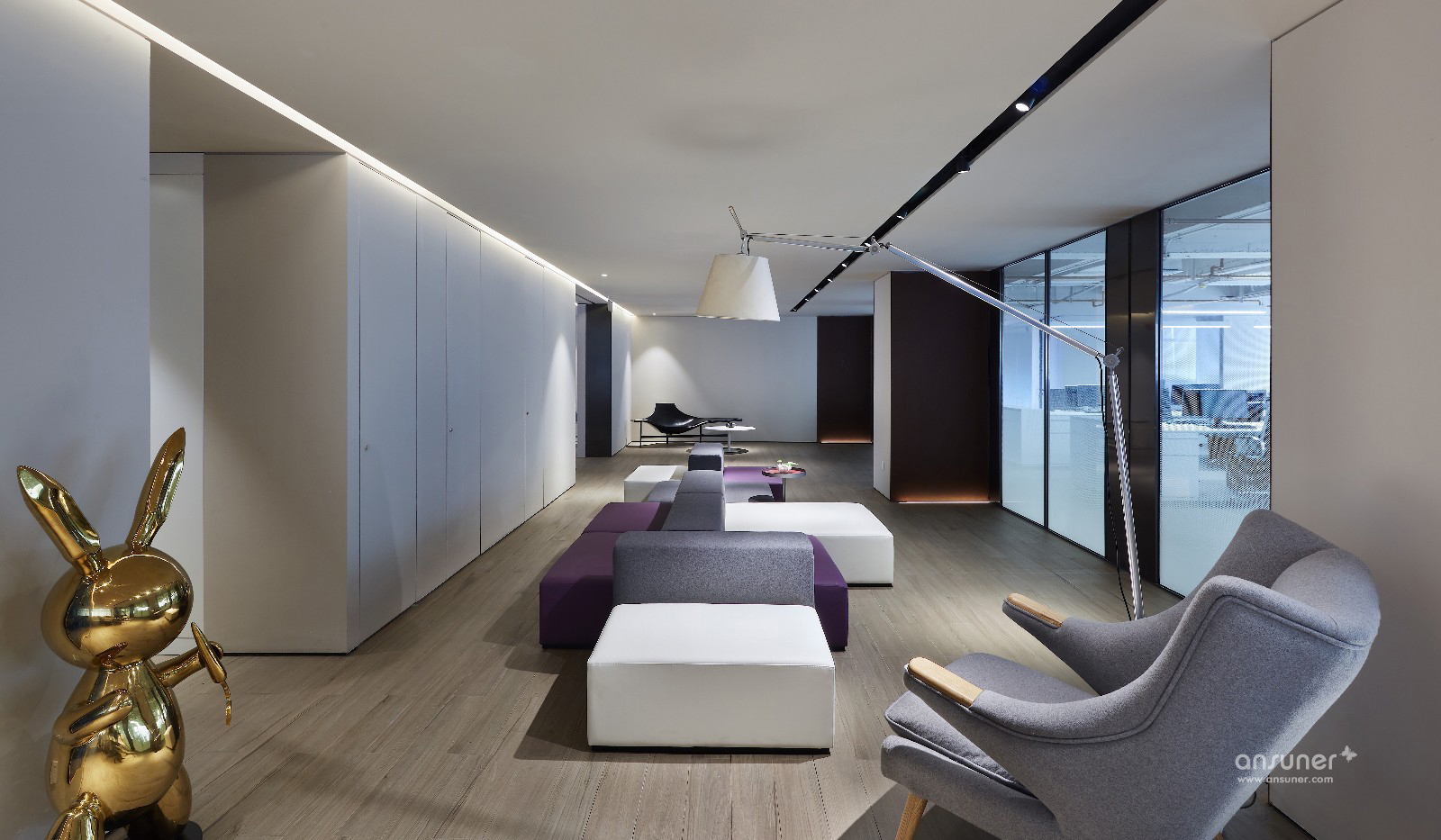 飞视设计之家这种办公组合形式给我们带来了一种开放式的空间体验:在这空间中,室内空间的划分十分灵活,通过家具的组织,形成不同的分区,传统的门厅、走廊、办公室布局已经不复存在,取而代之的,是一个完全开敞式的流动空间。水吧区提供着办公空间基本的管理和服务;大讨论桌除了提供休闲之外,还可以作为共享的会议区使用;休闲区则有着更多的开阔性,除了阅读、休闲还适合两三人的小组工作和讨论;如果你不想被来往的人们所干扰,则可以一头埋进工作站中专注手头的工作……总之,设计师将灵动开敞的空间使用方式代入到了该办公空间中:你可以在这里任意选择最需要的使用空间。