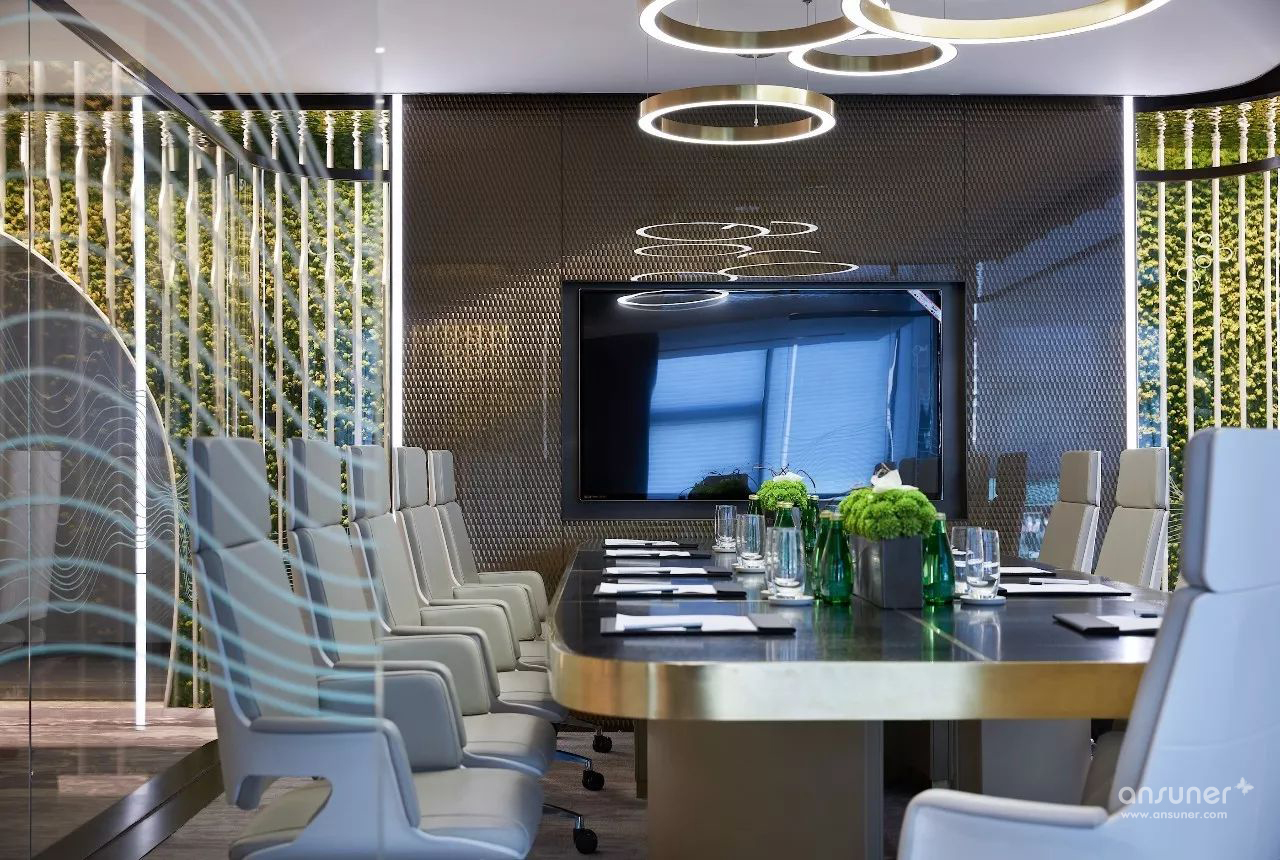 经理室融入会议功能,提高会议效率的同时大大的节约了功能空间。书吧区域可利用休息时间进行充电,让办公更具人性化,气泡式智能会议功能让办公环境更具科技感,设置互动讨论区可随时进行头脑风暴,座位对应墙面配置视频电视可随时转换为会议模式。