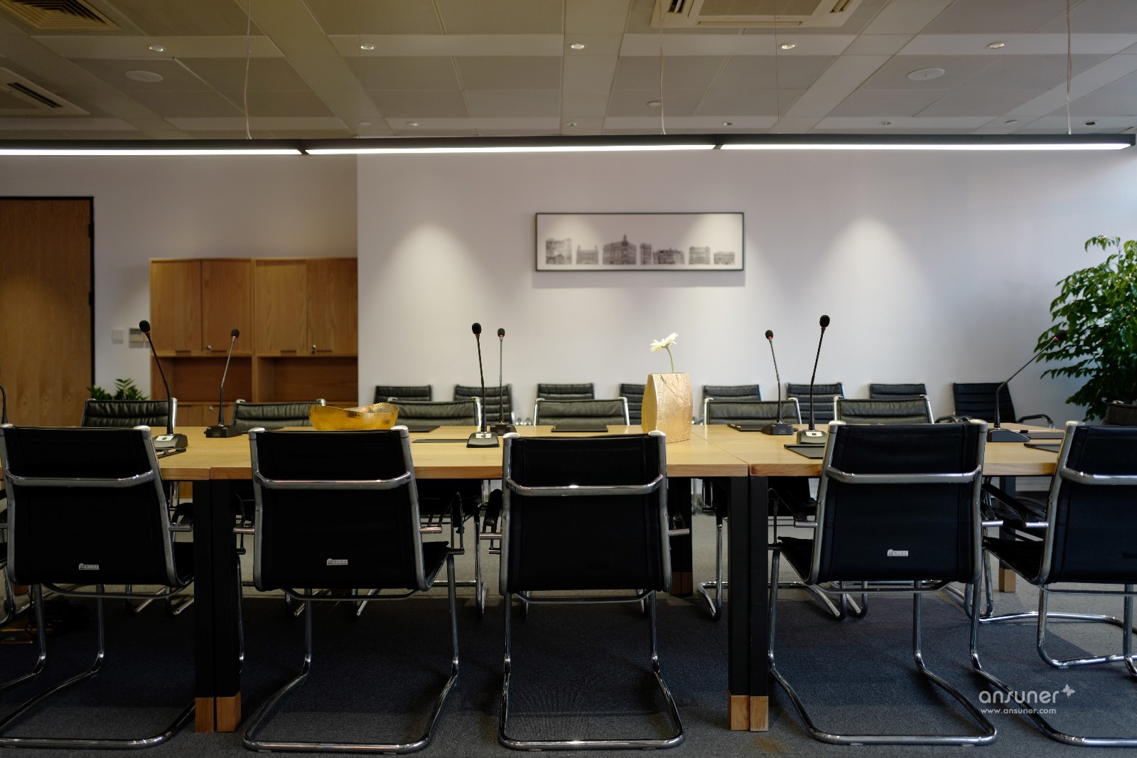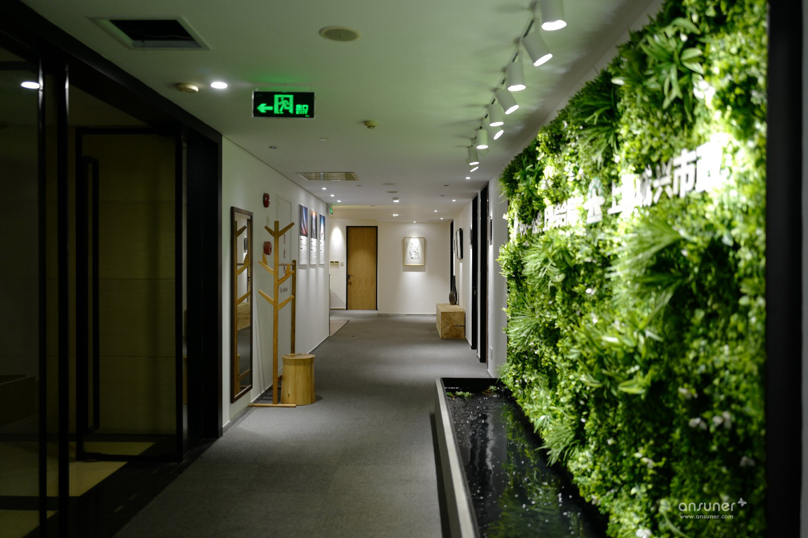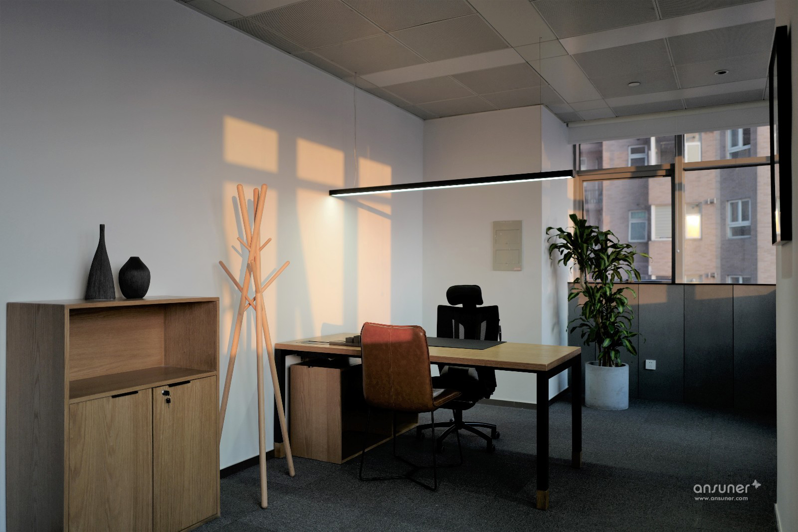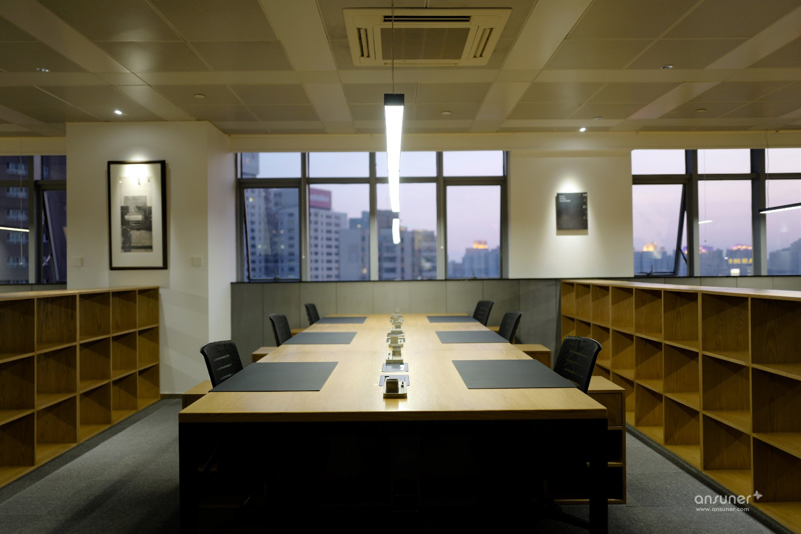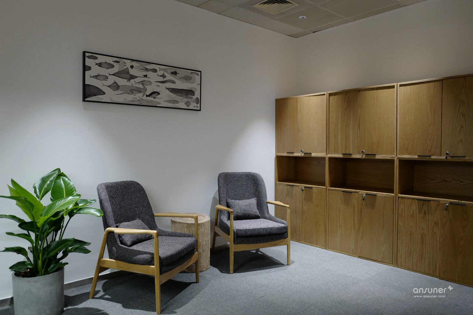 办公空间整体以暖灰色为基调,主材以黑铁、原木、木丝水泥板为主,辅以涂刷本白色乳胶漆的石膏板隔墙、深灰色阻燃块毯,配以4000k色温中性灯光,营造出宁静、平和的办公空间。