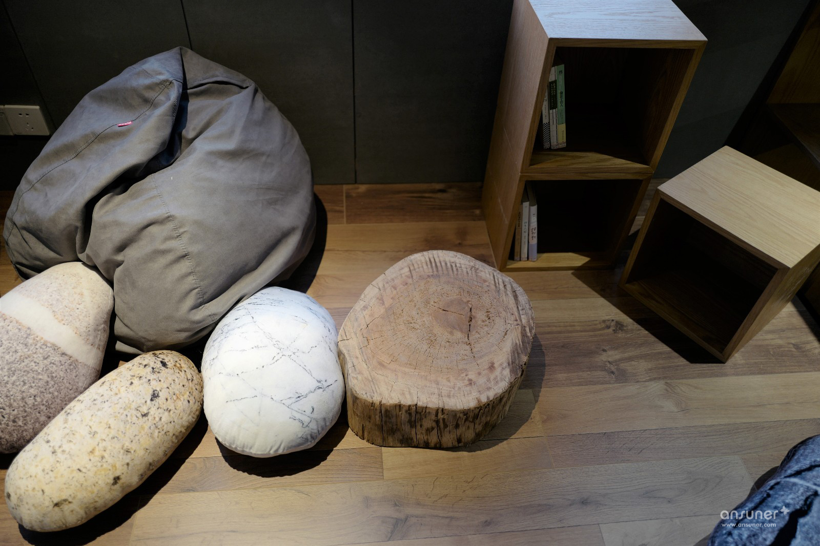 其中,茶歇区配置了吧台、桌子、沙发等不同功能家具,不论喝咖啡、吃外卖、会客都各得其所。阅读区则专门做了45厘米的抬高,需脱鞋进入,上面放置了懒人沙发和大量抱枕,不仅可以窝着看书,还可以睡午觉。