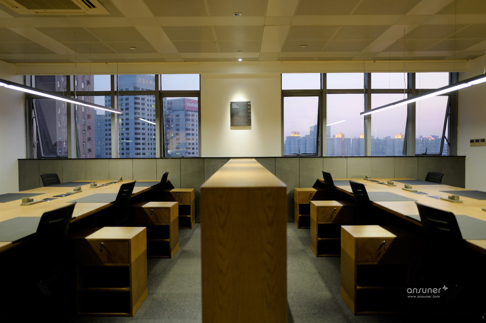 在照明设计上,设计师拆除了原空间灯管裸露的5600k高色温日光灯,在工作台上方重新布置了暗藏灯源的4000k色温长条吊灯,其它区域布置了高防眩筒灯,将原先令人精神高度紧张的冷白光照明改成区分重点、既能集中精神又不易造成视疲劳的点状中性光照明,让眼睛处于最舒适的状态。