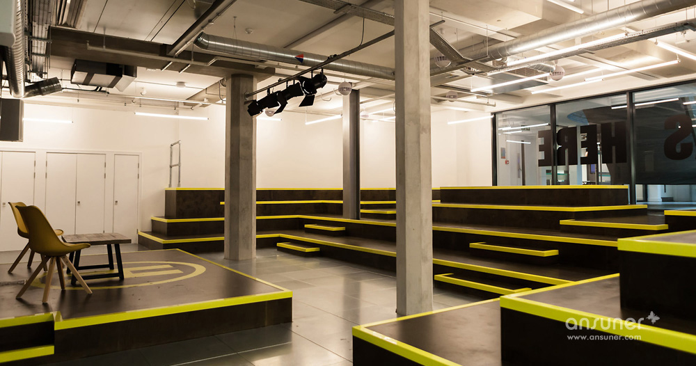 这是一处关注健康而又令人振奋的联合办公空间。这里不仅有常规的私人办公桌、专注工作区和开放热点工作台,同时还设计了大量满足工作所需的多元空间、以及不同的环境氛围和必备的功能。平面规划包括: ▼300人座的大礼堂,以染色夹板制作的阶梯式座位并配以专业的舞台灯光,可以直接从Huckletree和Alphabeta中庭进入,这里经常会为其会员和公众举办相关活动;