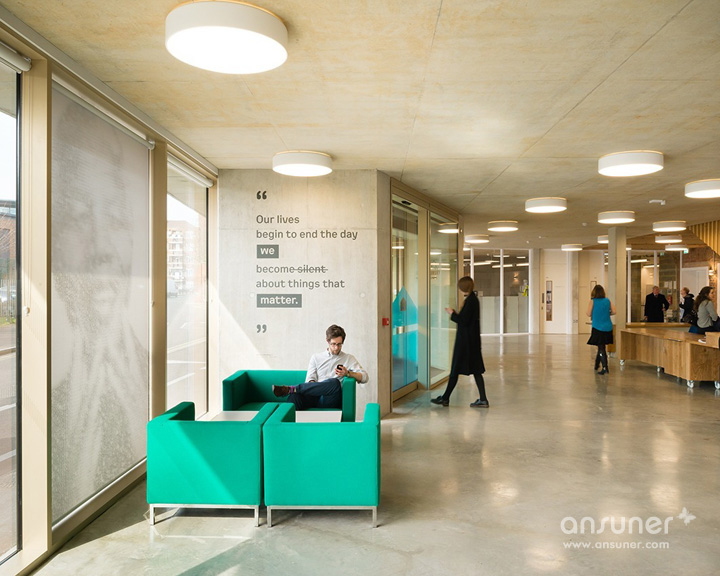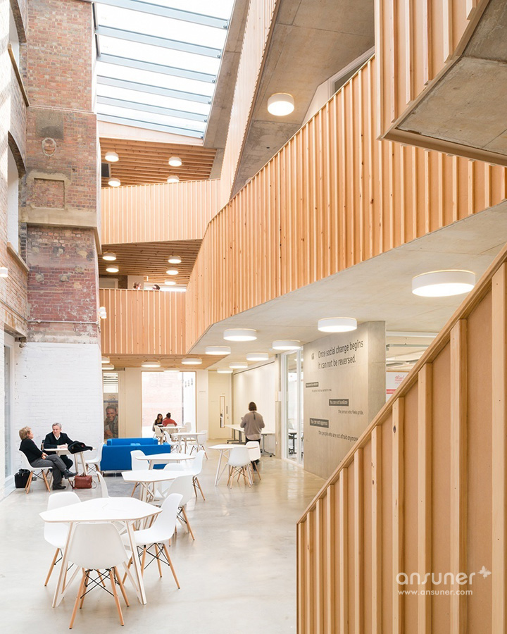 在入口处,由激光切割制作的The Foundry标志贴在混凝土墙面上,移动玻璃门上贴着由山墙建筑演变而成的蓝色造型标注着“进”与“出”的标识。室内的房间编号采用同样的激光切割工艺直接贴在门板上,房门上的公司名称则是可以随时撤换的。窗框的表现形式以重复间隔的木制竖条加以修饰,与室内的楼梯造型遥相呼应。室内空间表现出服务的主题:关注人权。以世界历史从古至今影响深远的思想家与人权领导者的名句构成一个整体的空间故事,并将文字与人物以艺术的手法构筑整个空间氛围,以此映射本案独特的文化思潮。户外楼梯间的透明墙体上装饰着醒目的黑色金属文字,昭告着人们此处的属性。以著名人物马丁路德金、昂山素姬、曼德拉和亚伯拉罕林肯等一系列超大肖像图形,装饰于一楼的会议室玻璃窗上。每个肖像均以其所说的言论以文字图形塑造。
