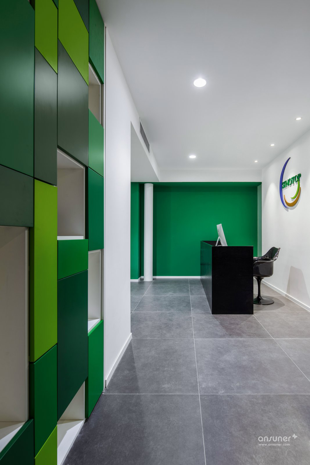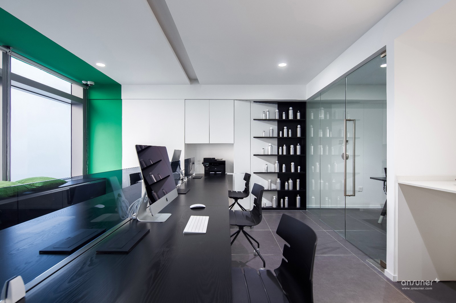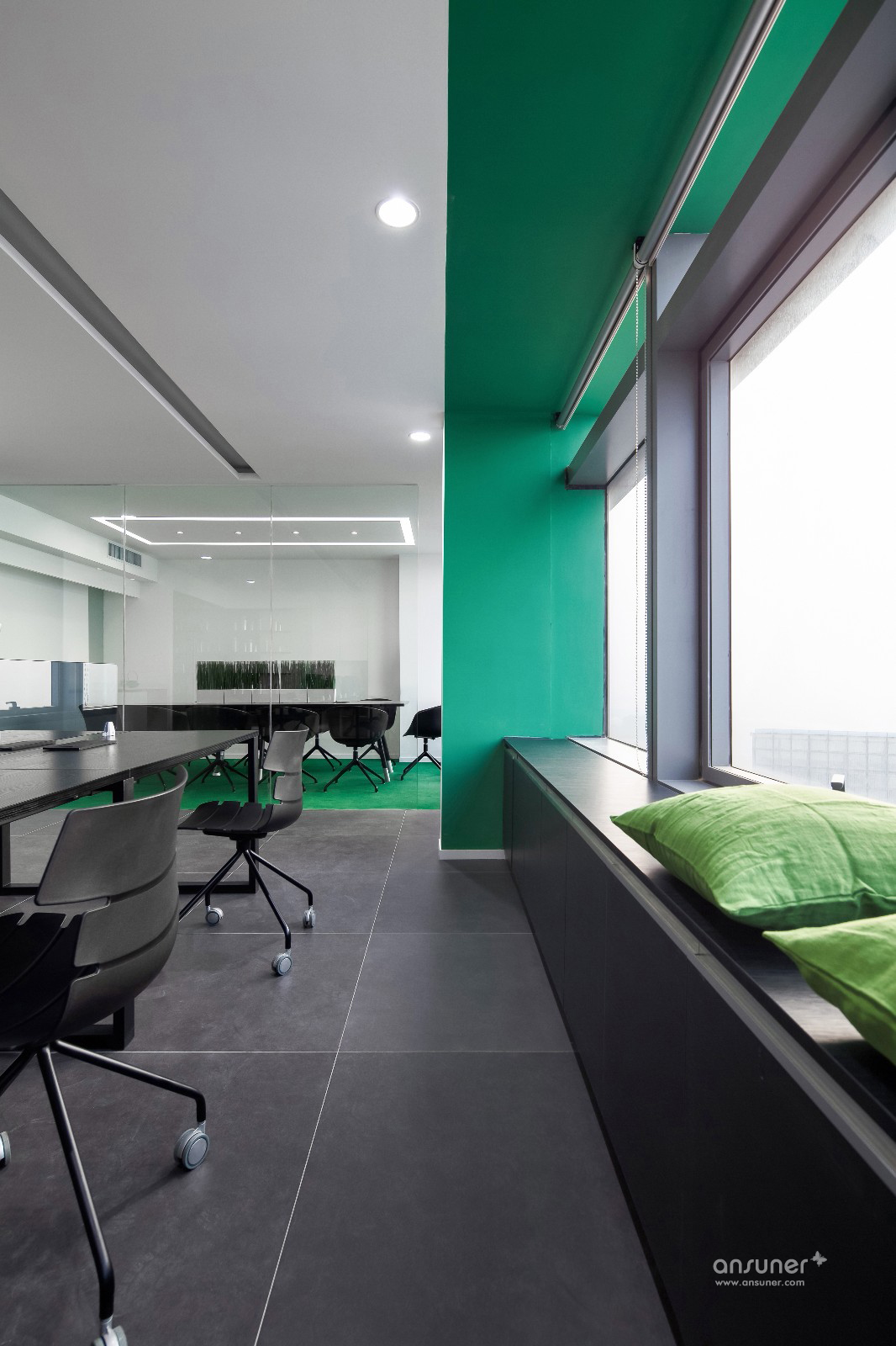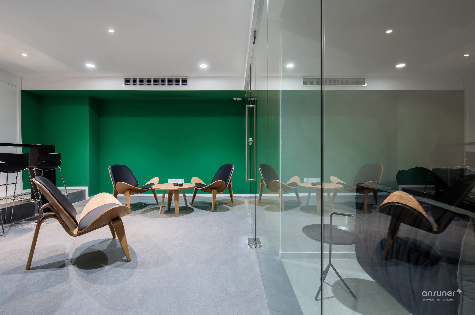 设计师从公司的Logo中汲取灵感,结合公司的产品特性,将Logo中的绿色巧妙融入设计,力求为业主打造了一个崭新、舒适且和公司形象高度吻合的办公空间。