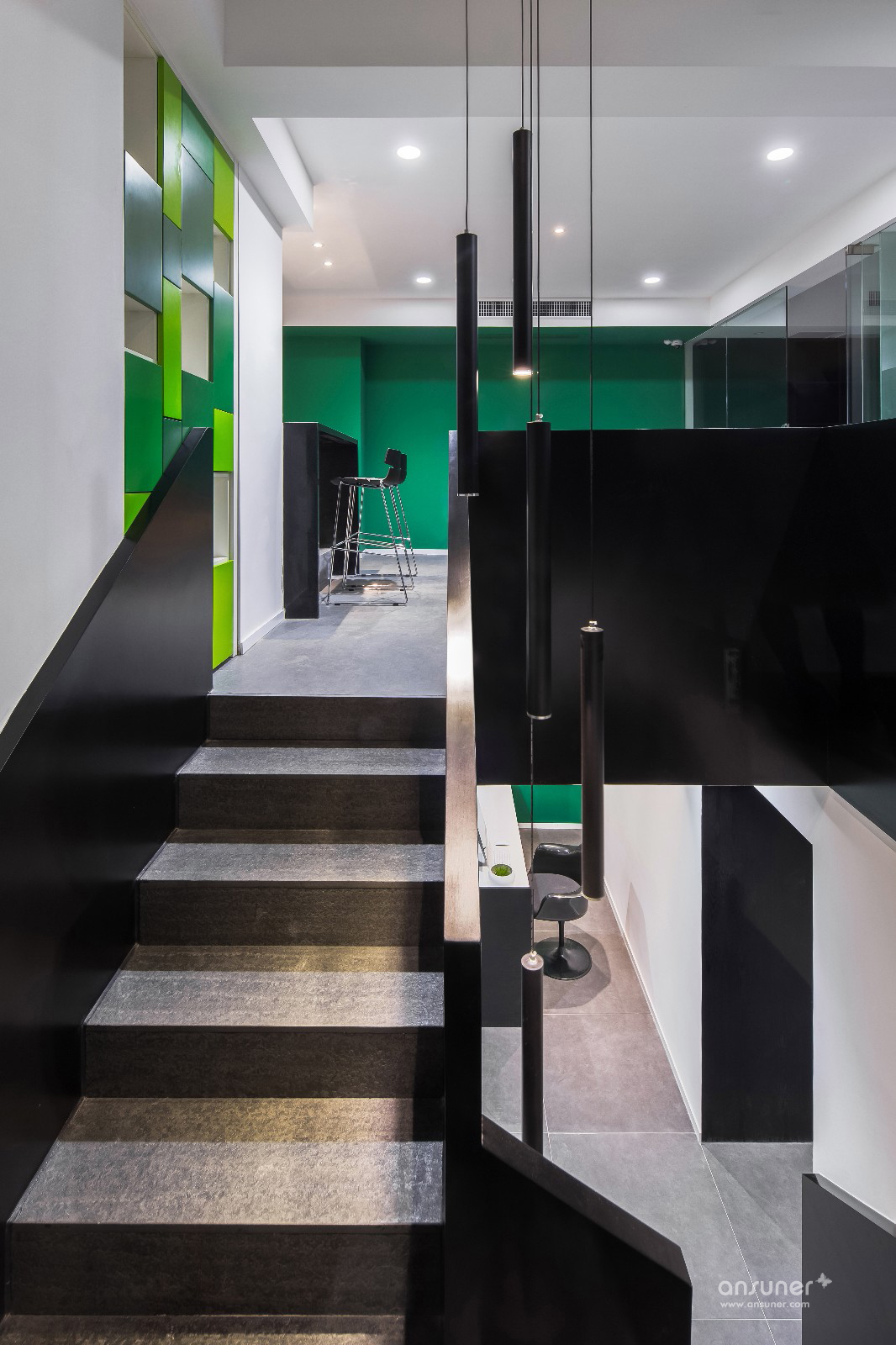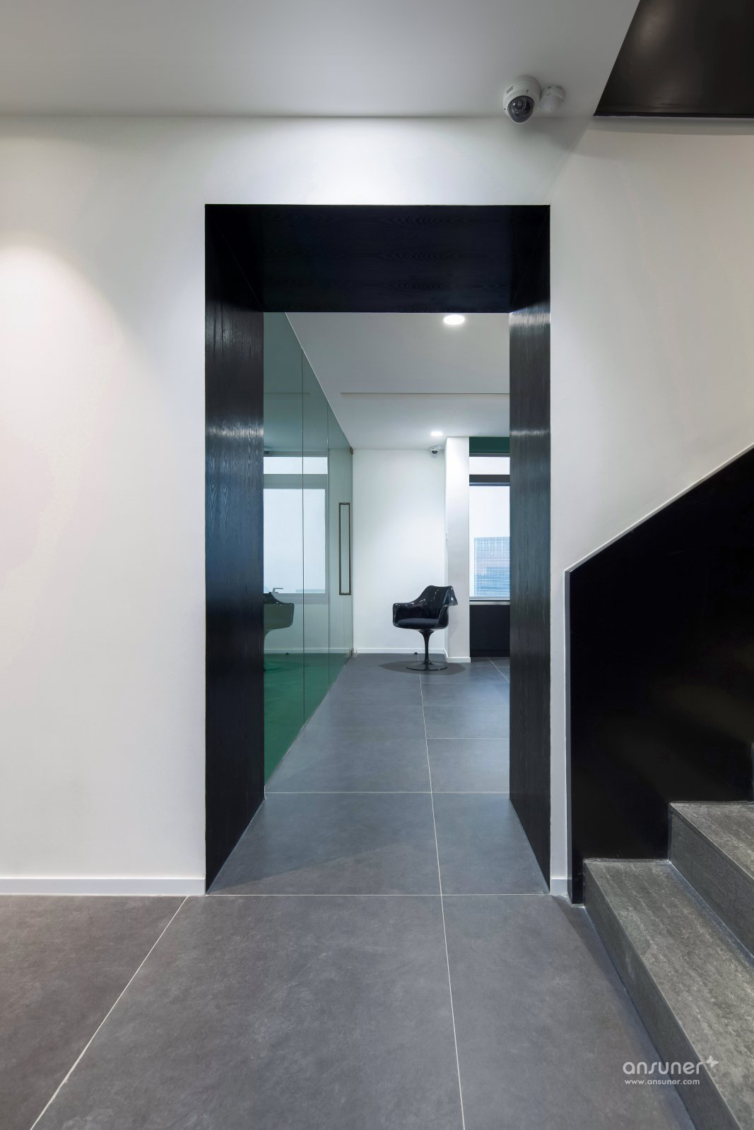 右边楼梯亦是黑色的,甚至连接办公区和前台区的门洞也是黑色,两种看似没有什么关系的色彩在设计师的巧妙摆弄下却显得无比自然和谐