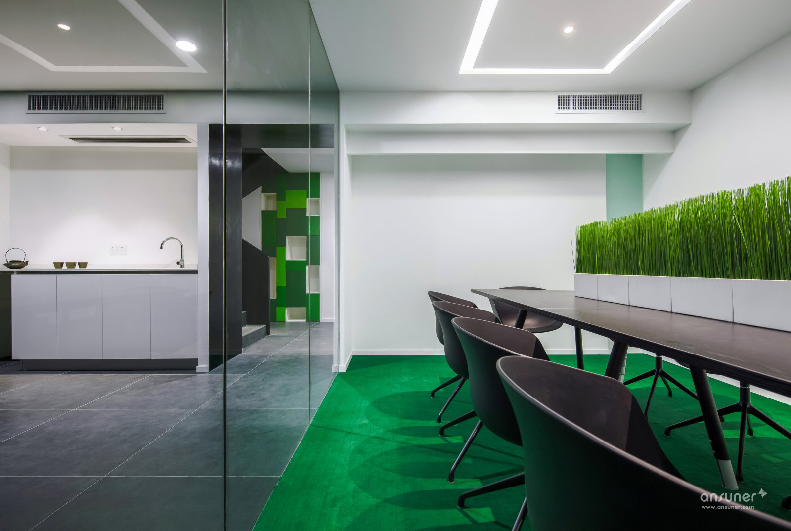 会议室紧靠开放式员工区,并用透明钢化玻璃作为隔断,绿色的地毯寓意着茂盛的草坪,配合会议桌上的一排绿色植物饰品,客户犹如坐在了自然环境中,片刻便能体会到公司的专属文化。