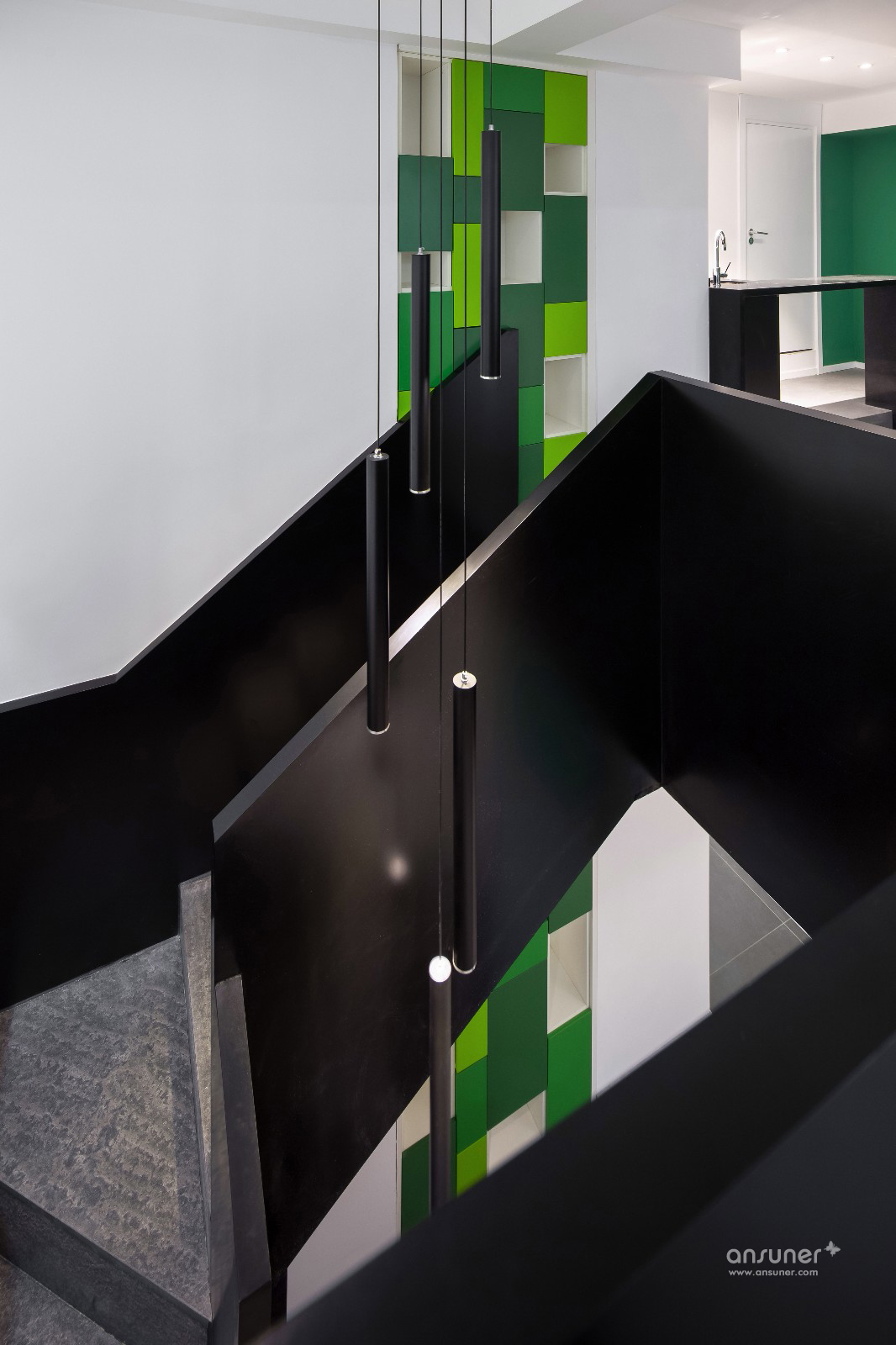 沿着黑色楼梯往上走,你的视线一定会被那组许多色块组成的柜子所吸引,它至下而上,穿过楼板一直延伸到房屋的最高点。每一块门板大小不一,色彩各异。没错,简直像极那款经典游戏—“俄罗斯方块”。不同绿色的组合带来了全新的视觉体验,呼应整体设计的同时释放出轻松愉悦的信号。