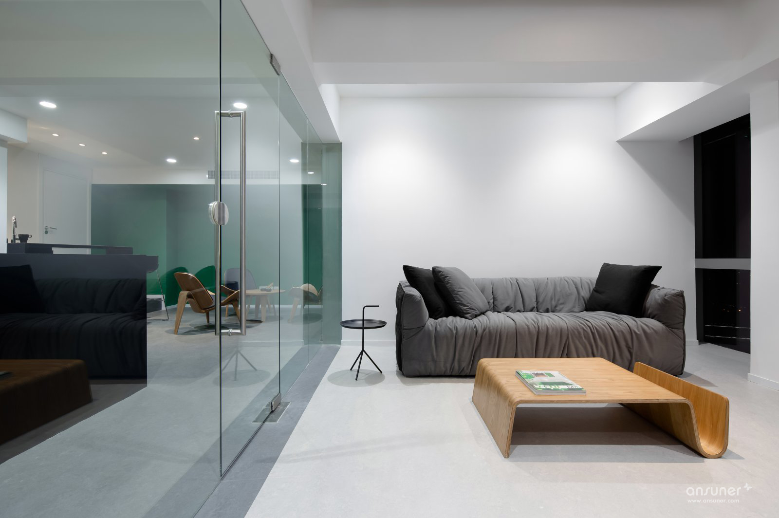上来二楼,所有的功能空间围绕休闲区设置,亦采用大面透明玻璃材质,目的除了最大化的空间利用也是让视线和光线自由的进出。设计师巧用原始建筑落差,在储物间门边设置了吧台,如果感觉会议室过于严肃,那么让我们邀请客户到二楼休闲区促膝长谈吧,咖啡、红酒在这里都可以轻松实现。