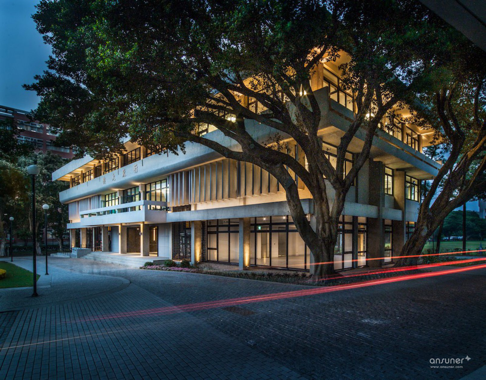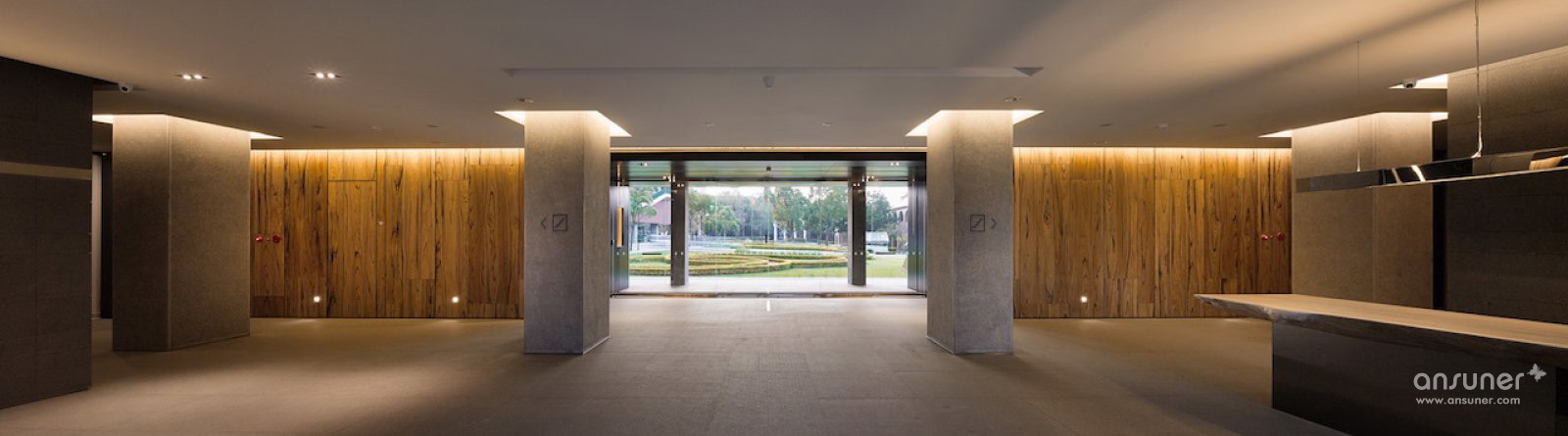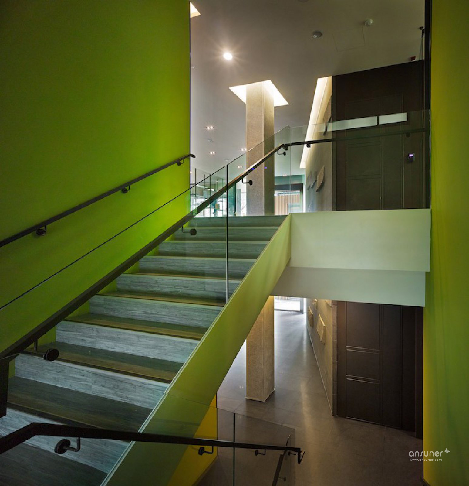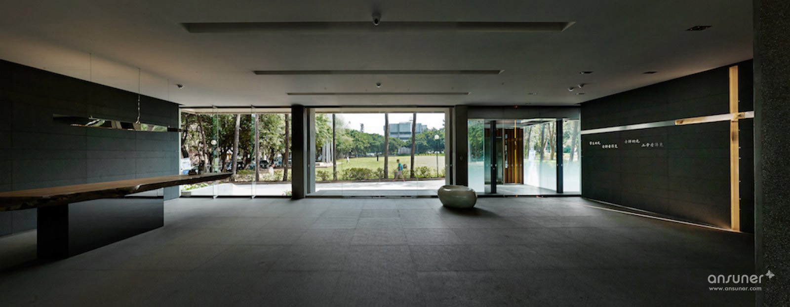 建筑物一楼以最少的墙体包覆,开放的设计,有光流泄,有风在动,透明的空间容器被户外的草皮绿意围绕。