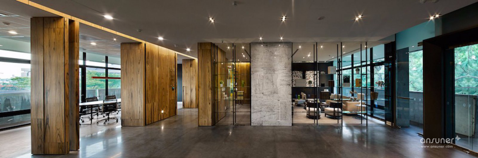拾级而上,厚实的石块墙体同样以15度的斜轴贯穿二、三楼。短轴长轴的概念重现;短轴串起前后的透明电梯及楼梯,是各楼层的动线枢纽;长轴左侧的大会议室与沿着长轴排开的工作空间,紧密而不冲突。