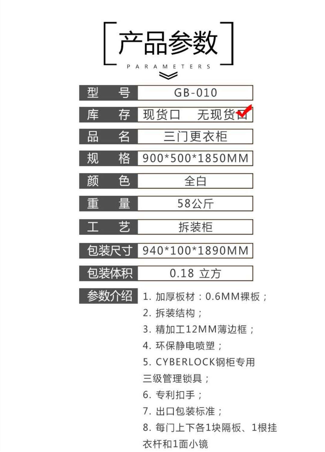 1.加厚板材:0.6MM裸板 2.拆装结构; 3.精加工12MM薄边框; 4.环保静电喷塑 5.CYBERLOCK钢柜专用三级管理锁具; 6.专利扣手 7.出口包装标准; 8.每门上下各1块隔板、1根挂衣杆和1面小镜。