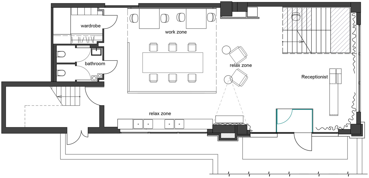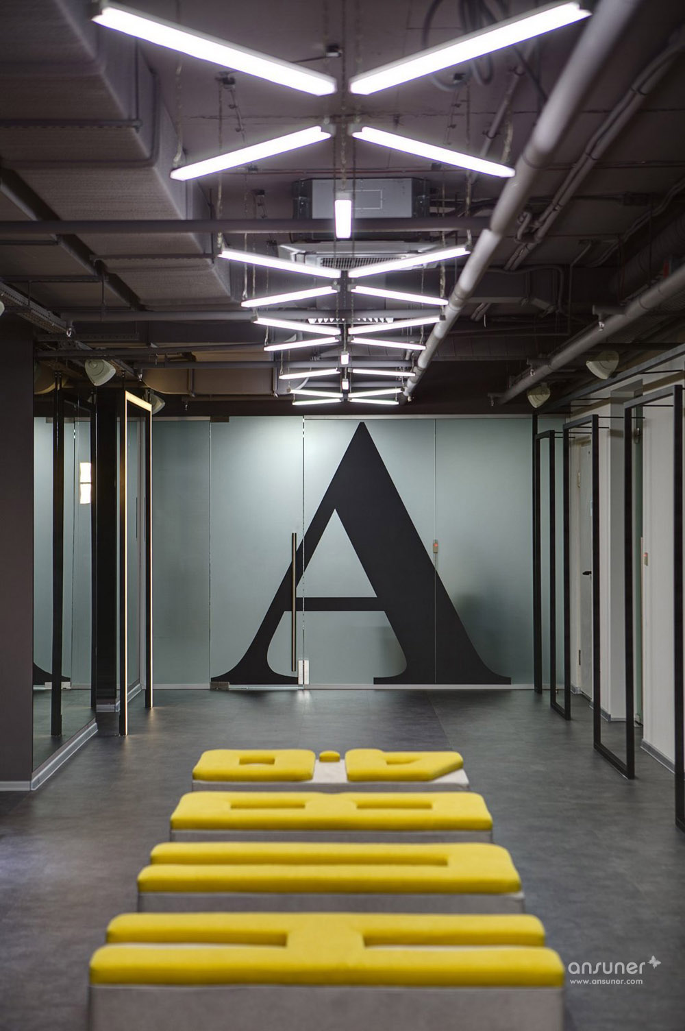 在一层的大厅,一幅热熔金属打造的“HUB 4.0”LOGO装饰板醒目的矗立眼前,其后的楼梯采用清透的玻璃护栏。动感明亮的灯光勾勒出长形的接待台。胶合板制作的创意隔墙界定了工作空间。