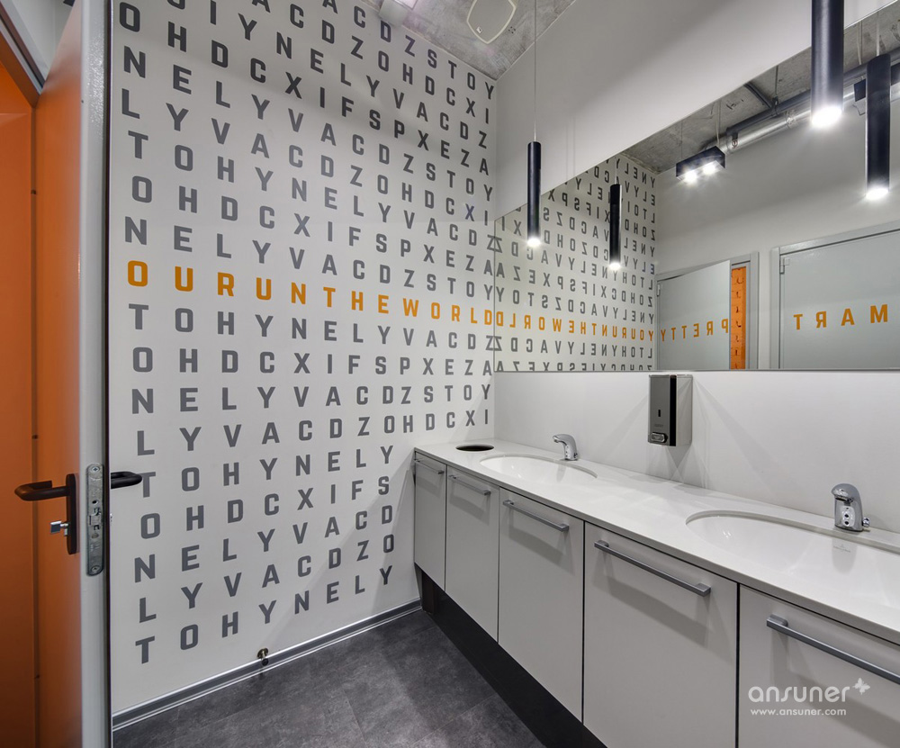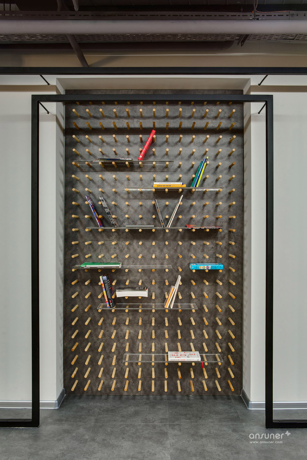 三层主要用作联合办公空间,配有会议室、skype视频聊天室、以及几间专题会议室。这里还配以开放而流动的OD网页版、以及采用接待区的格调布局的商务洽谈区。在这个洋溢着极简工业美学的工作空间里,设计团队运用了大量的创意吸引创业者,如鲜明饱和的色彩点缀、大量的创意图形与文字设计等。