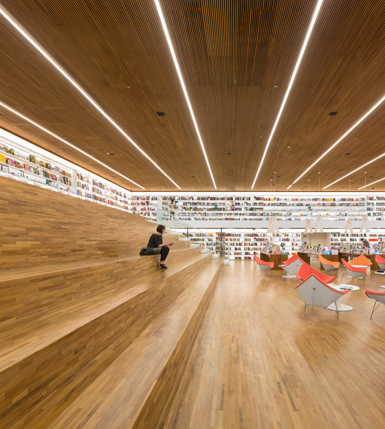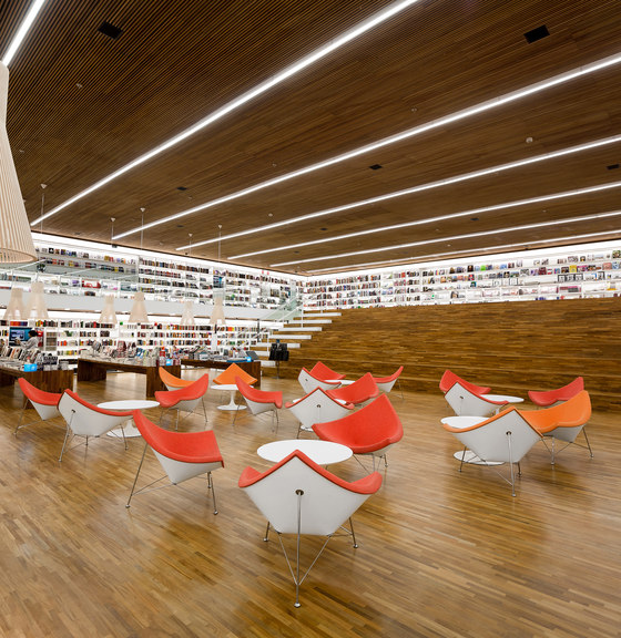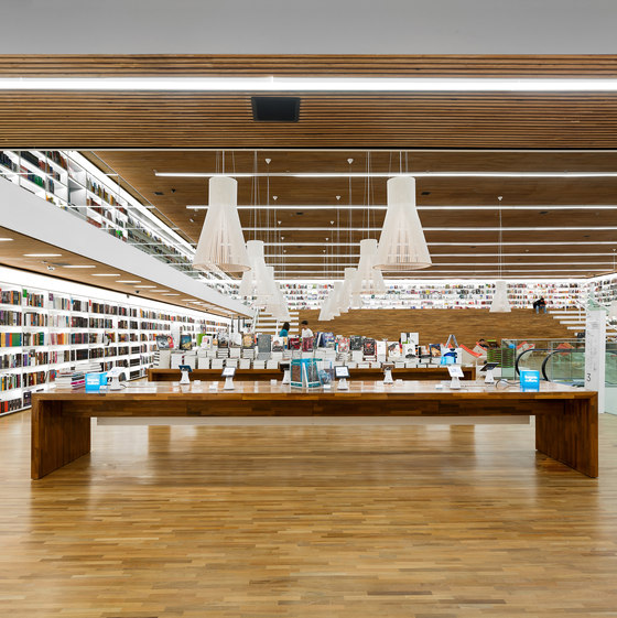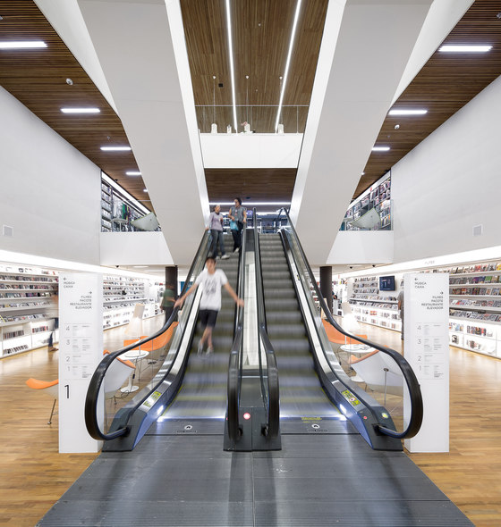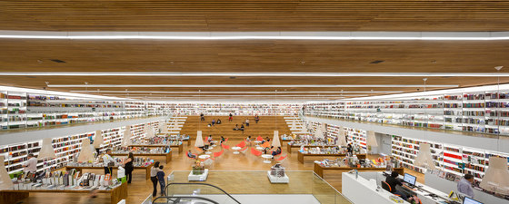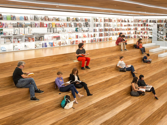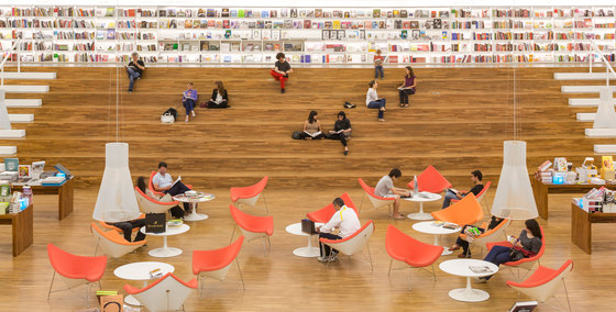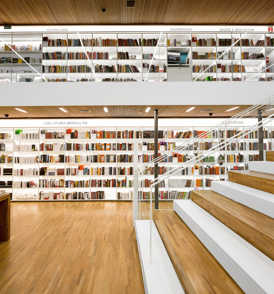 Uma livraria como um espaço de encontro. Foi essa a principal premissa do projeto arquitetônico da Livraria Cultura do Iguatemi. Mais do que apenas um lugar de compras, a loja é convidativa para a permanência e convivência. Assim buscamos que os visitantes não apenas entrem na livraria, mas fiquem por lá. A entrada é feita por uma porta de 7,7m, na qual os caixilhos de alumínio e vidro são inteiramente recolhidos, deixando a passagem livre. Nesse piso, com dimensões mais intimistas, estão os produtos audiovisuais, como CDs e Blue Rays, e um café no jardim. Um jogo de escadas rolantes leva até o grande vão da livraria, perpassando um andar intermediário, que tem brinquedos e histórias em quadrinhos – o chamado Espaço Geek. Chega-se então ao andar superior onde há um grande salão, com poltronas e mesas, além de uma arquibancada de 21 metros de largura aberta para todo o vão. Convidativa para folhar um livro ou mesmo para abrigar pequenos concertos e palestras, essa estrutura conduz os visitantes para o mezanino aberto. Os livros envolvem o lugar, apoiados em onze grandes mesas dispostas ortogonalmente no salão e em estantes brancas na periferia. Essas prateleiras tem iluminação de led embutidas e formalizam a delimitação do espaço, como em cubo revestido internamente por livros. Uma sala multiuso, especialmente para conferências – que ganhou o nome de café filosófico –, uma sala para livros infantis e um jardim para crianças, completam o programa. O piso e o forro, assim como as mesas de display, são de madeira. Já os demais planos usam laminados brancos e distinguem as paredes laterais do resto. Guarda corpos de vidro minimizam a interferência visual desses elementos no espaço, desaparecendo no conjunto. A iluminação é feita por linhas de luminárias e completadas por pendentes no centro do salão superior. A configuração da planta da livraria, especialmente por meio de uma circulação aberta buscou a fluidez e continuidade espacial. O percurso arquitetônico se inicia em um espaço acolhedor, até chegar a um lugar monumental, vivo, onde ficam a maioria dos produtos e onde os visitantes podem interagir uns com outros, onde podem pegar um livro e ler um capítulo antes da compra, onde podem simplesmente descansar olhando o movimento. Pensamos que assim, como espaços convidativos e agradáveis que acabam por propiciar a sociabilização entre pessoas, são as livrarias no século XXI. O programa é a própria vivência da loja.